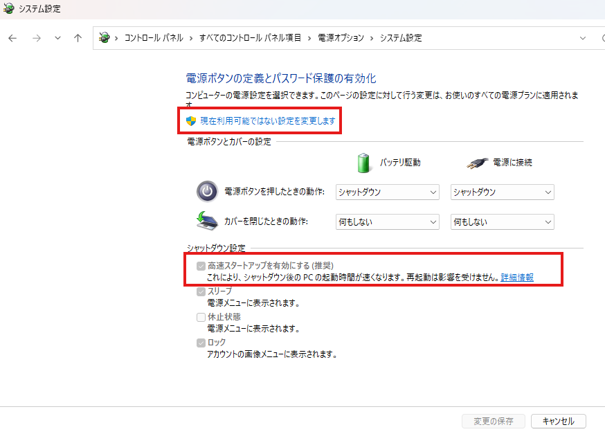 - 高速スタートアップをオフにする 画面下の「高速スタートアップを有効にする(推奨)」のチェックを外します。